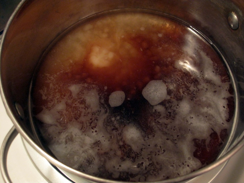 - Place water and both sugars in a saucepan. Cook over medium-high heat and bring to a boil.