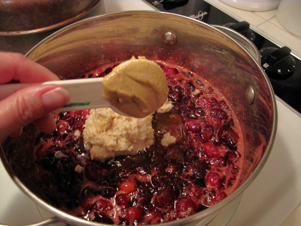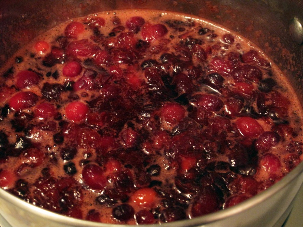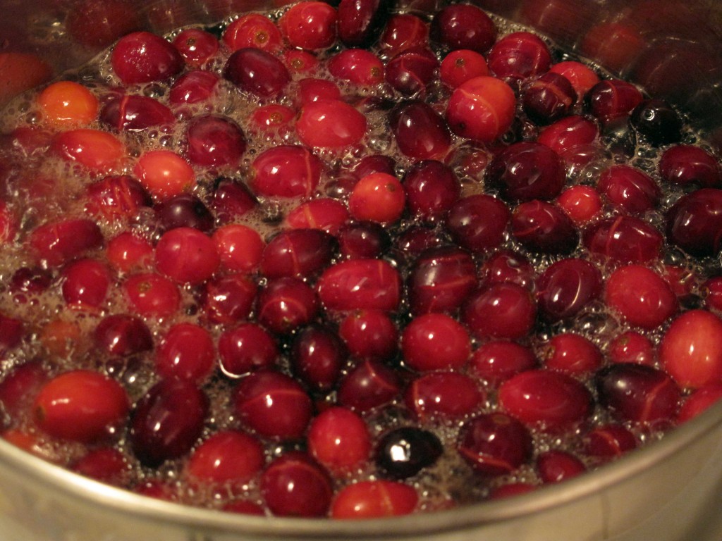 Return mixture to a boil, then reduce heat and simmer – stirring often – for 10 minutes. Cranberry skins should be popped and the mixture should thicken. Remove from heat.