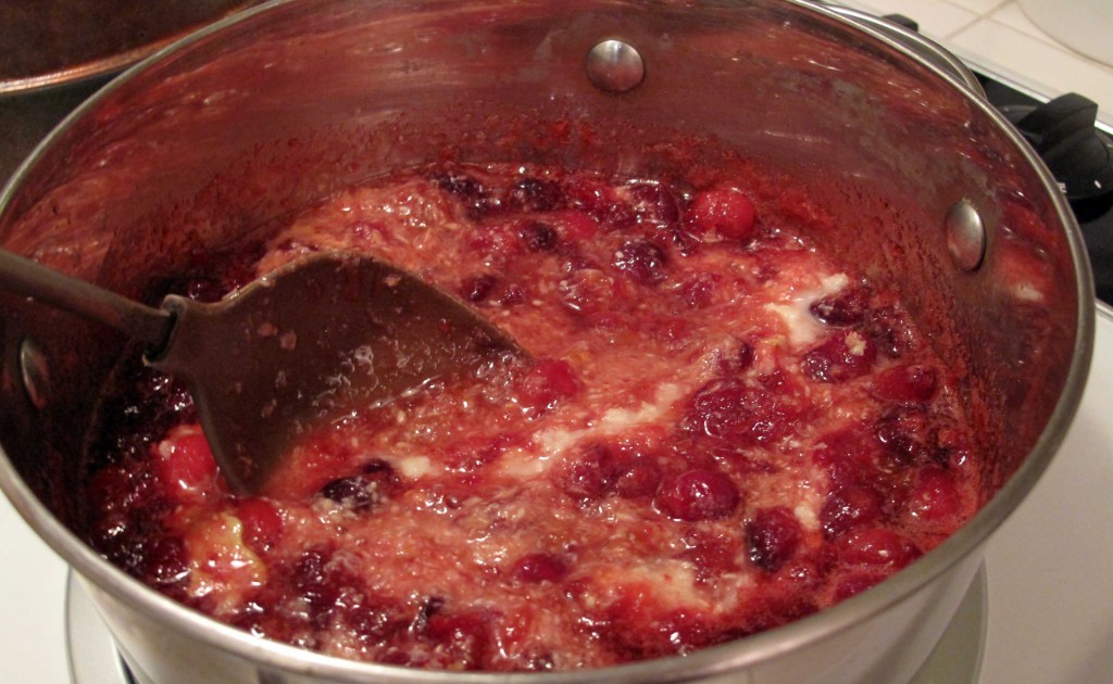 - Return mixture to a boil, then reduce heat and simmer – stirring often – for 10 minutes. Cranberry skins should be popped and the mixture should thicken. Remove from heat.