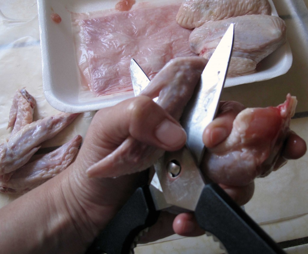 Next (still being careful), firmly hold the wing sections, pointing toward you. Again, slide your shears – pointing away from you – between the two edible wing sections. Cut. This one is sometimes a little tougher, but don’t worry. Kitchen shears were built for this sort of job. Finish cutting all remaining wings into sections.