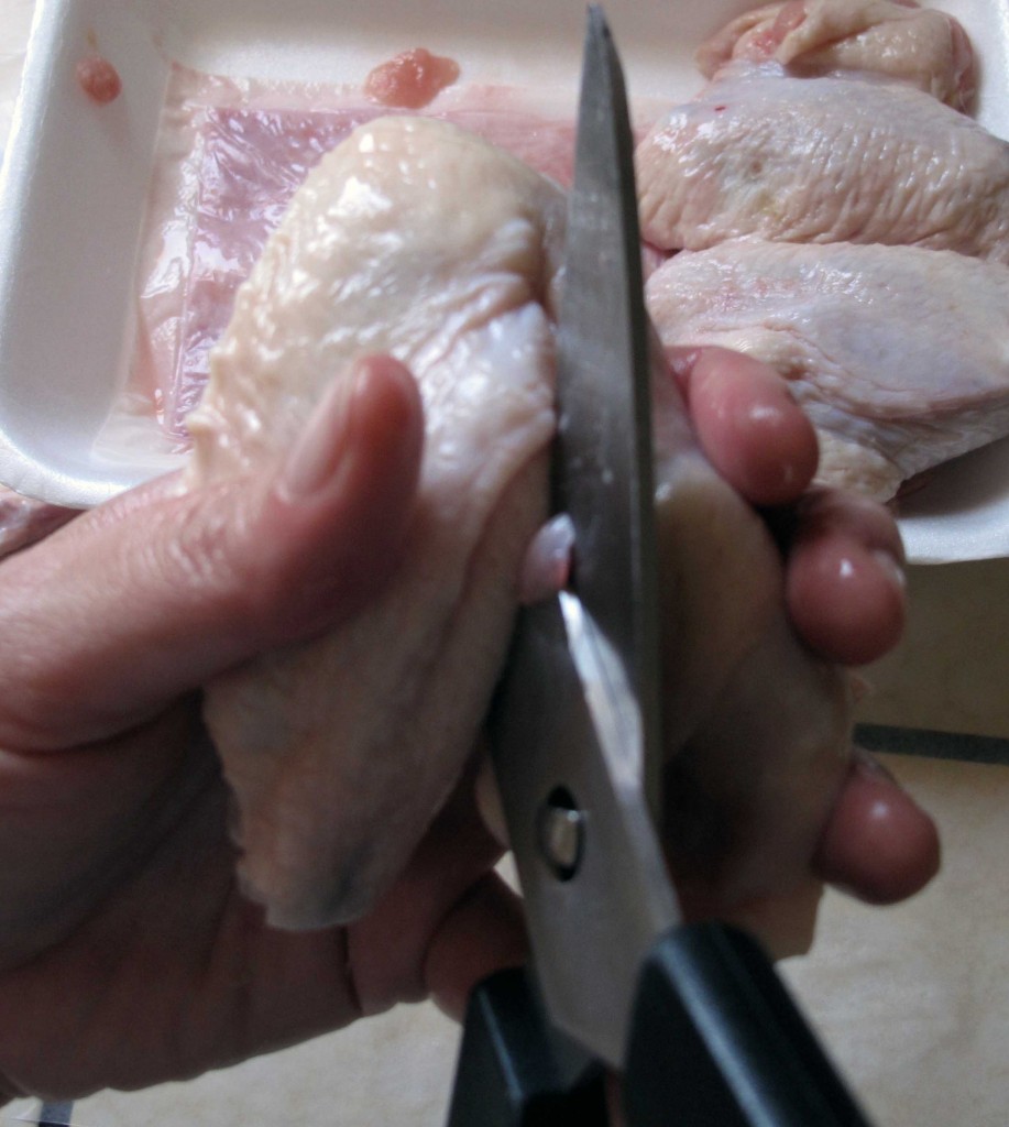 - Prepare the wings. If you’ve purchased pre-cut sections, great – skip to the next step. If your wings are whole, use kitchen shears to cut into sections (discarding nibs).