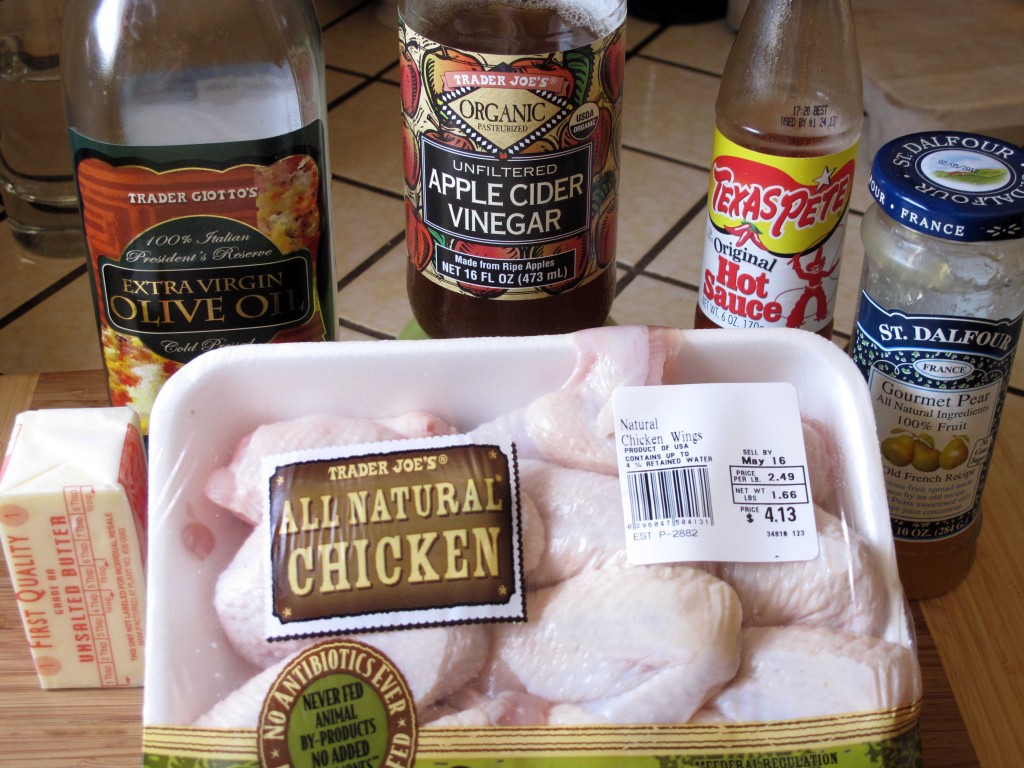 Chicken Wings, Your Favorite Hot Sauce (not Tabasco), Butter, Cider Vinegar, Fruit Preserves (any kind will work), Olive Oil, Salt and Pepper