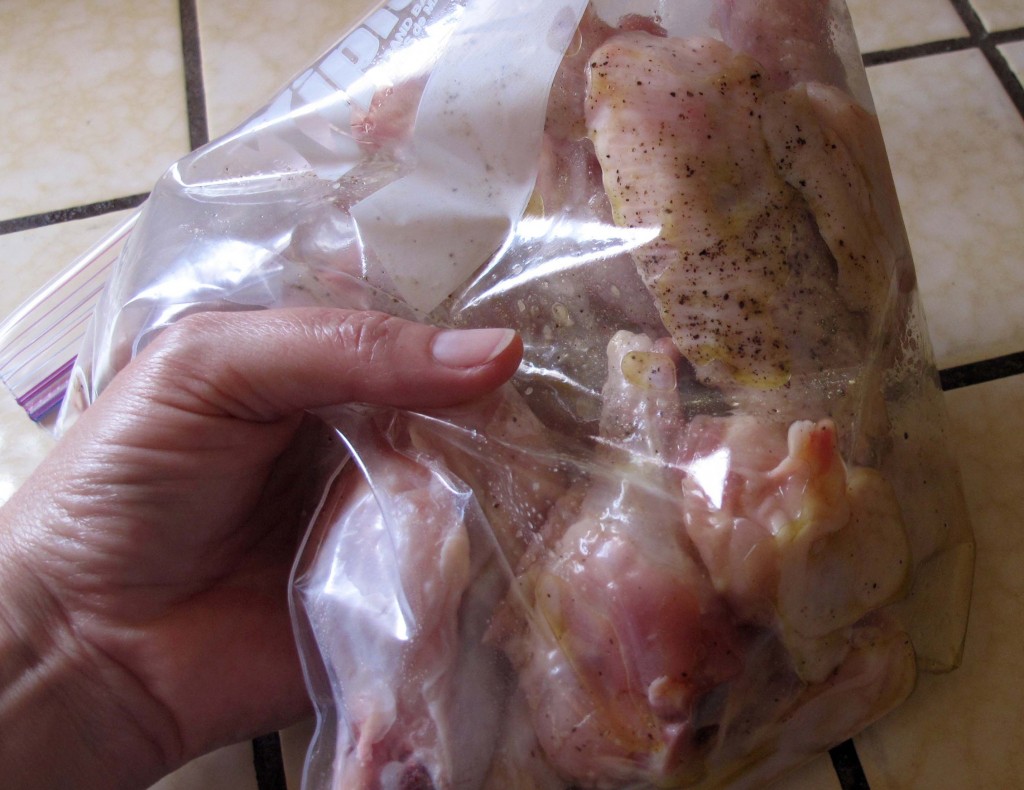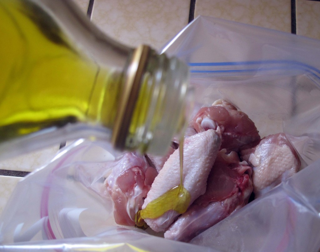 Place the edible wing sections into a bowl or large, plastic bag. Pour a couple of tablespoons olive oil over…