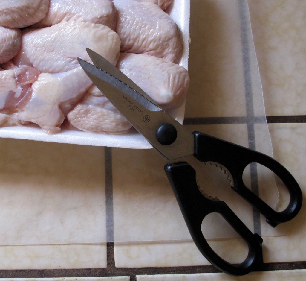 Being extra-special-careful, firmly hold the uncut wing with the “nib” pointing toward you. Slide your shears – pointing away from you – between the nib and first wing section. Cut, separating the nib from the edible wing. Either discard the nibs or cook them for broth. I always toss them, but that’s just me.