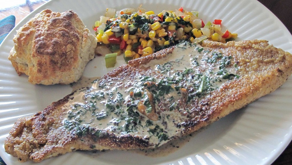 So I made a huge lunch of fried catfish with basil-cream sauce, sauteed veggies and biscuits. (I’m not blogging it, as it isn’t my recipe. But if you get a hankering, here’s the link to the source.)