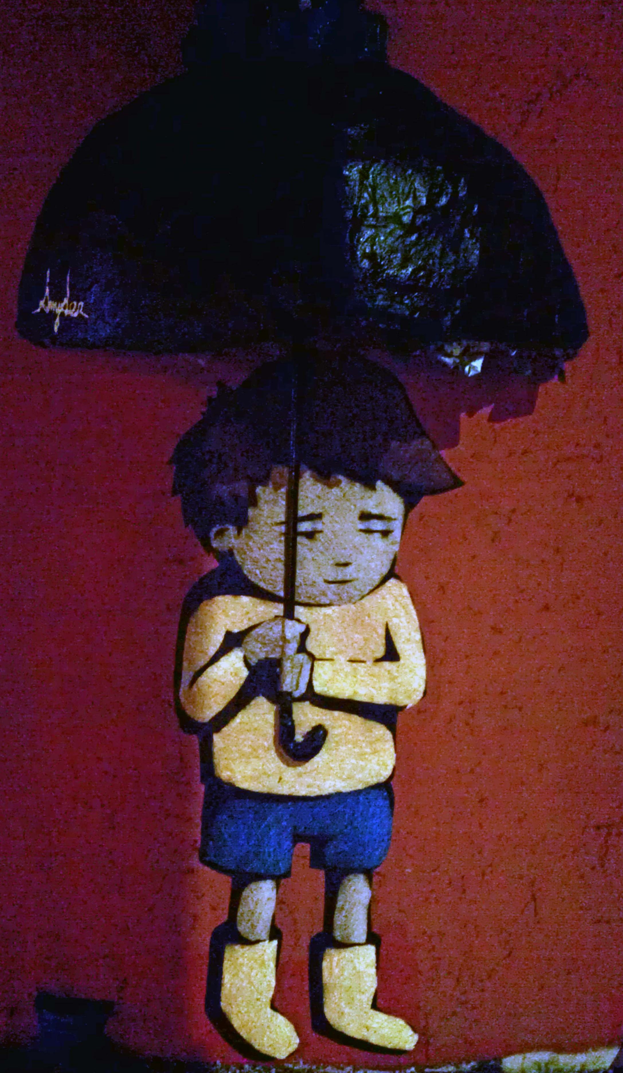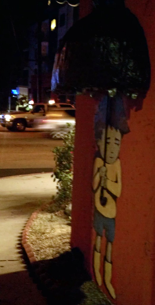One night I walked out of a club and was talking with folks on the street when I noticed this little guy on the side of a building. I say “little” but he was close to my height. And I don’t know if you can tell from the above photo, but his umbrella was 3-dimensional…
