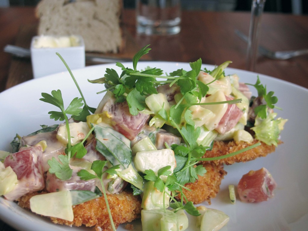 Yellowfin Tuna, Fried Green Tomatoes, Yuzu Guacamole & Sambal Aioli. I didn’t even know what half of that description meant, but I didn’t need to know. I only had to taste it to discover it was an amazing dish. The tuna’s ocean freshness, paired with the crunch of the fried green tomatoes was a lovely combination. Mix in the bite of the celery and the cool smoothness of the guacamole and y’all, I was one happy gal.