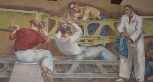 This was painted just before WWII and was, I believe, a WPA project. (If you don’t remember that one from your schoolin’, look it up, yo!) It’s positioned rather high and spans the full width of the wall. It has a companion painting at the other end of the post office. The whole building was built during that time and it’s gorgeous. I love this post office so much, I go out of my way to take care of my bid-ness there.