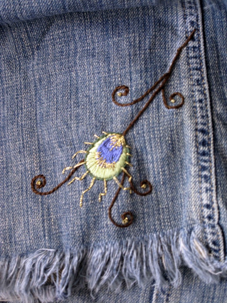 Late last year, I had started embroidering an old pair of jeans. You know, giving them some spit and a promise. Perking them up. As is my wont, I spread my projects out all over the flippin’ place. That pair of jeans – along with my embroidery threads and tools – took over the dining room table. Since I’m slow, my sewing project became a fixture of the table.
