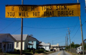 I grew up seeing the low bridge sign shown above, in Griffin, GA. It’s still there. And I’ll tell ya, that sign is still a humdinger.