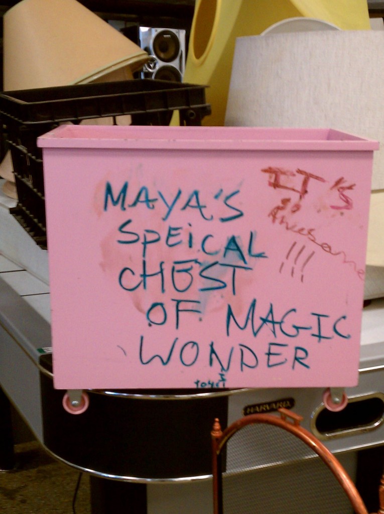 I was at a thrift store yesterday, looking for old bowling balls (yes), when I caught sight of this. For some reason it made me happy. I even managed to overlook the spelling mistake. I don’t know if “Maya” came up with this idea or if it was presented to her. Either way, it made me want to have a little place where I can store my own Magic Wonder.