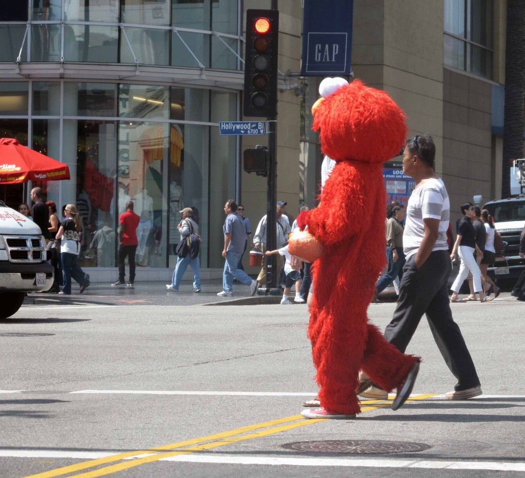 I was at a stoplight in Hollywood. Hollywood & Highland, to be precise. And there was Hollywood Elmo, on his way to work. Maybe Elmo’s got a family. Maybe Elmo’s got bills. You just never know.